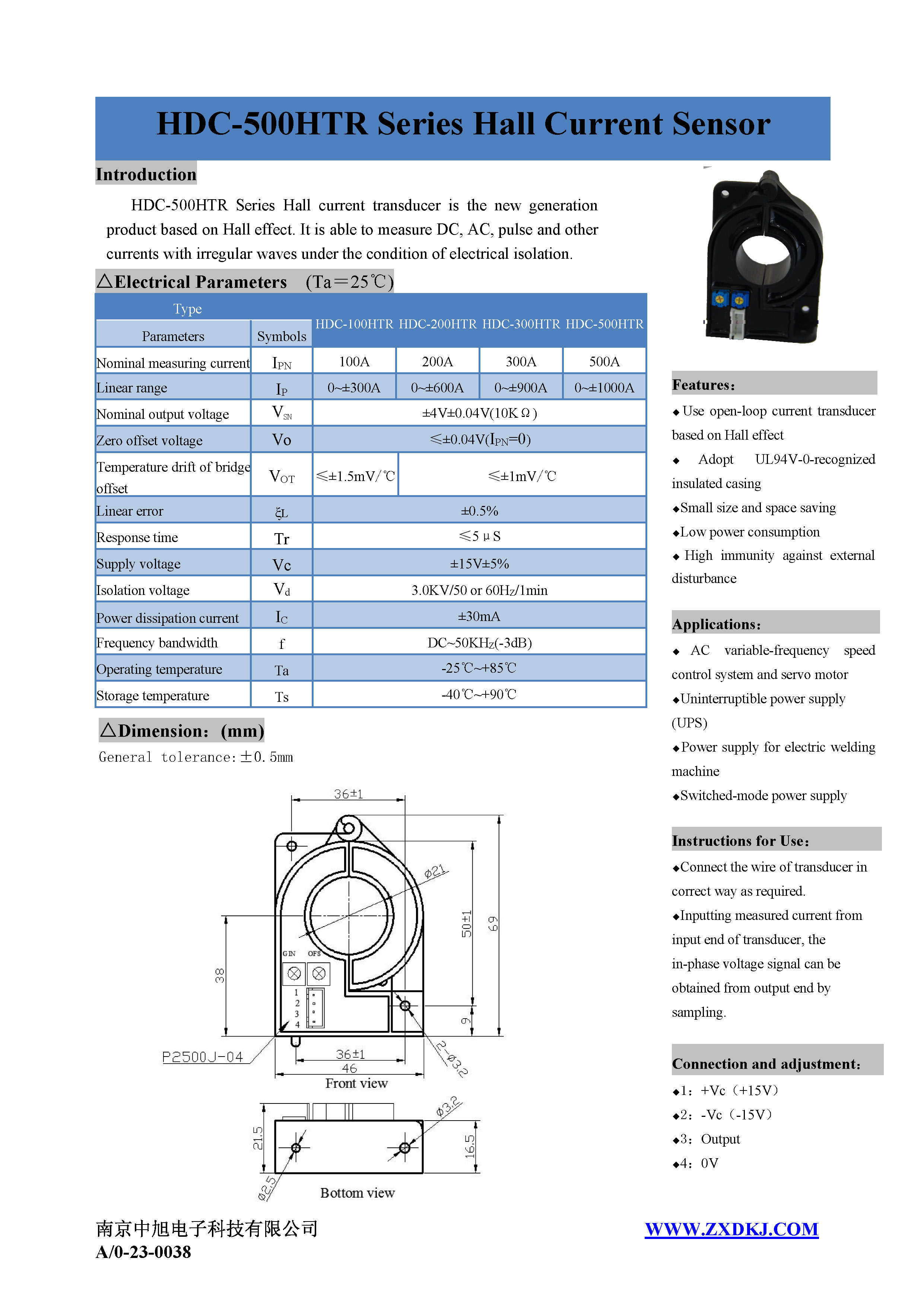 HDC-500HTR series Hall current sensor is a new generation of current sensor using the principle of Hall effect. It can measure currents of DC, AC, pulse and various irregular waveform under electrical isolation.