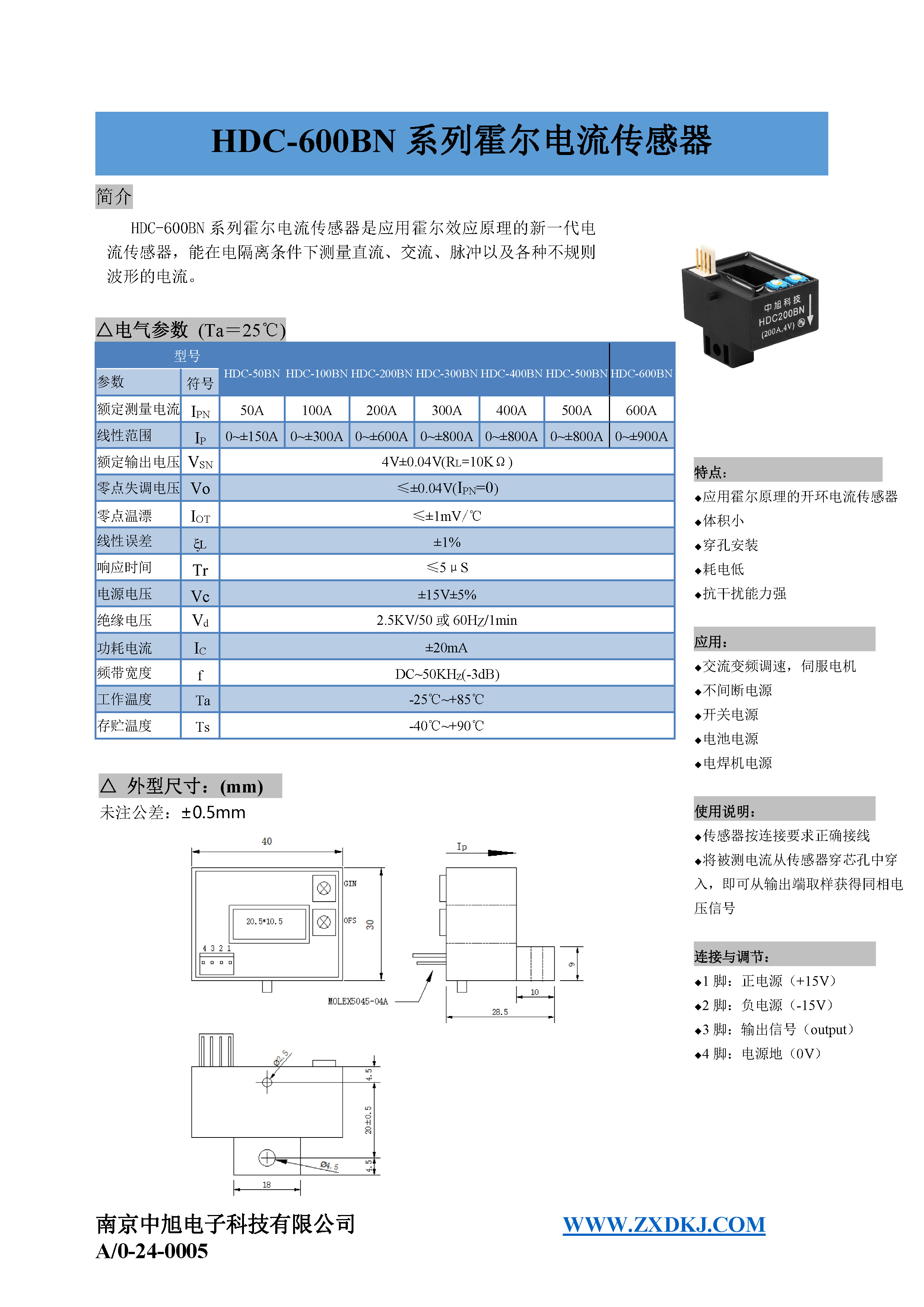HDC-200BN series Hall current sensor is a new generation of current sensor using the principle of Hall effect. It can measure currents of DC, AC, pulse and various irregular waveform under electrical isolation.